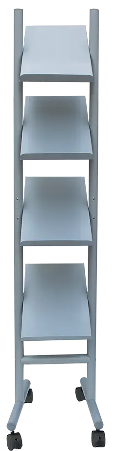 kovový stojan opatřen stříbrnou práškovou barvou, police naklopené pod 45° - přední 40 mm hrana, 4 otočná kolečka vybavená brzdou