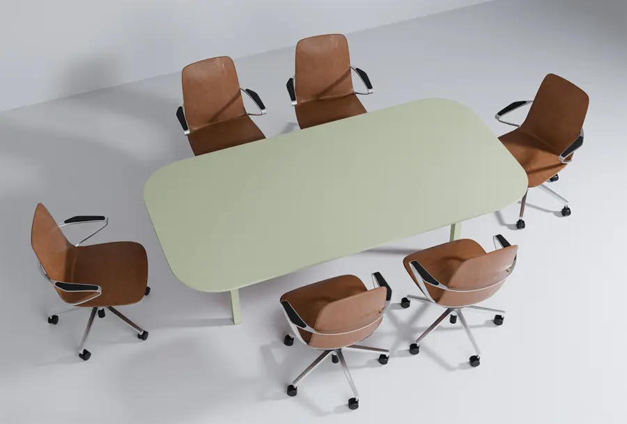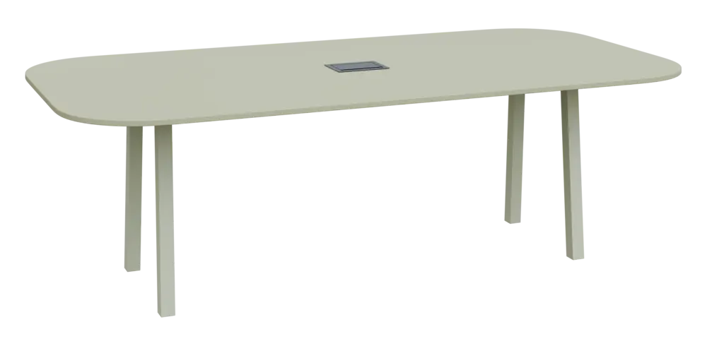 Stolové desky jsou vrstvené, což je velmi moderní, a mají organický tvar, který je nejen ergonomický, ale také pohledově příjemný. Jednací stůl je vybaven zásuvkovým systémem DIGITEL, který obsahuje 3× 230V. Na přání lze vybavit jakýkoliv stůl tímto zásuvkovým systémem.