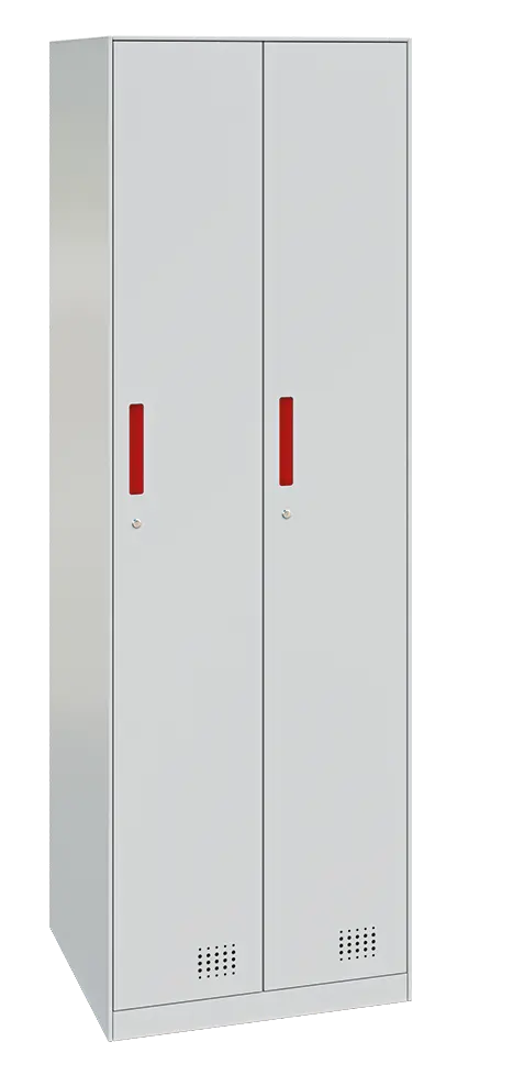 dvoudvéřová uzamykatelná kovová šatní skříň, konstrukce korpusu z kvalitního ocelového plechu, na vnější straně dvířek jsou zapuštěné úchytky