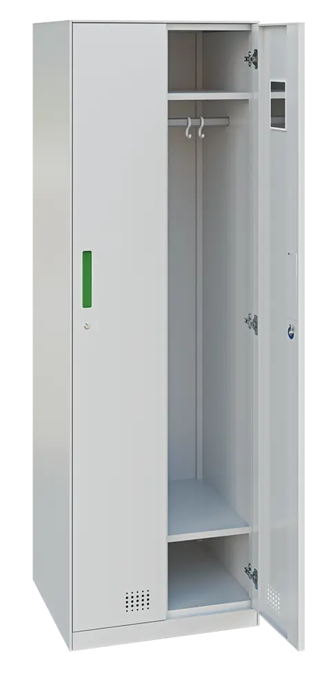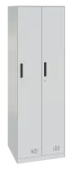 dvoudvéřová uzamykatelná kovová šatní skříň, konstrukce korpusu z kvalitního ocelového plechu, na vnější straně dvířek jsou zapuštěné úchytky