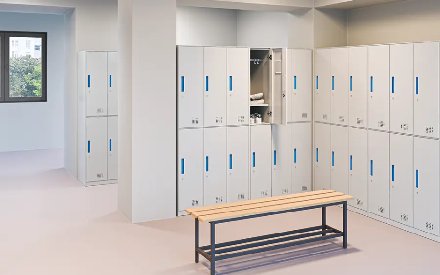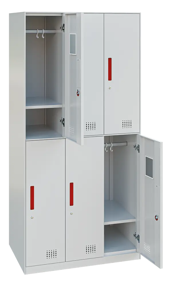 6-ti dvéřová šatní boxová skříň vyrobena z kvalitního ocelového plechu, elegantní úzký rám skříně 8 mm, na vnější straně dvířek jsou zapuštěné úchytky