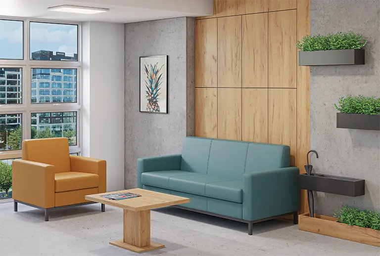 sedací souprava s oddělenými místy k sezení, vhodná do recepcí, čekáren a kanceláří, kovové nohy v antracitovém laku, čalouněno v kožence