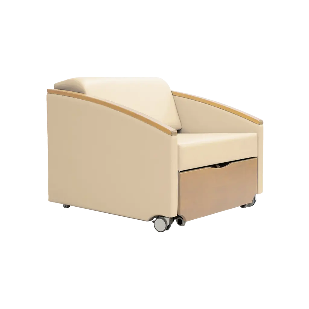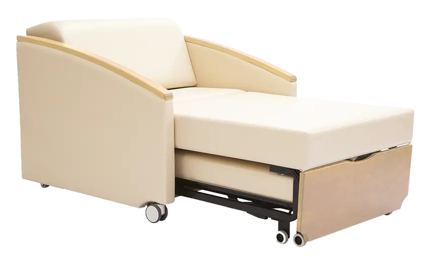 kombinace odpočinkového komfortního křesla a pohodlné postele, tři polohy - v sedě, s vytaženou podnožkou, plně rozložená pro spaní, sedák a opěrák je vyroben z kvalitní PUR pěny splňující normu ČSN EN 1021 - 1,2