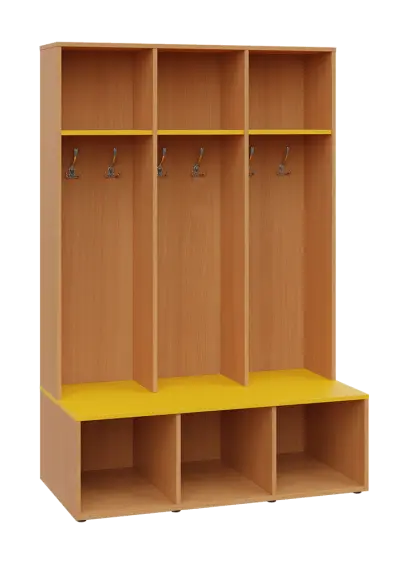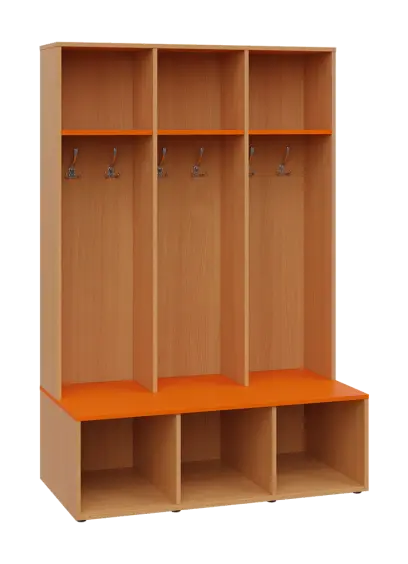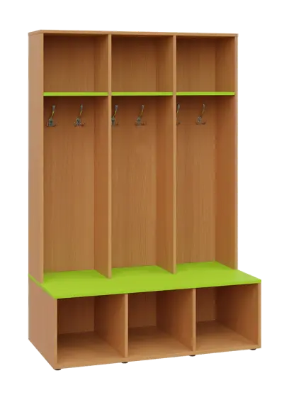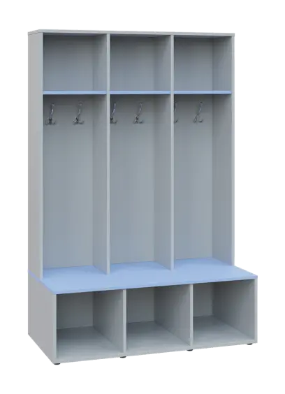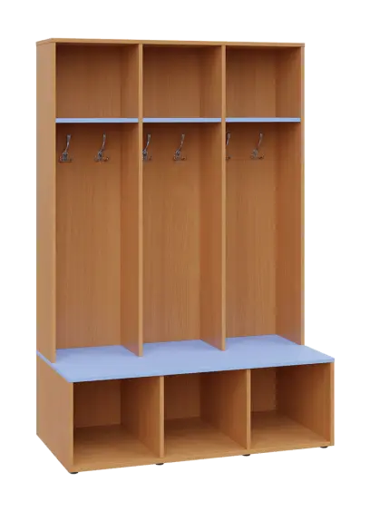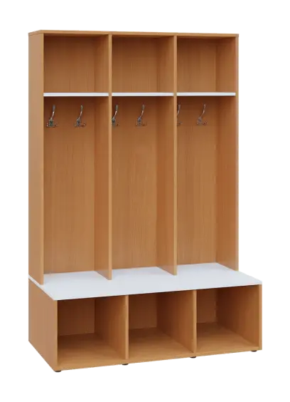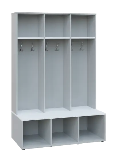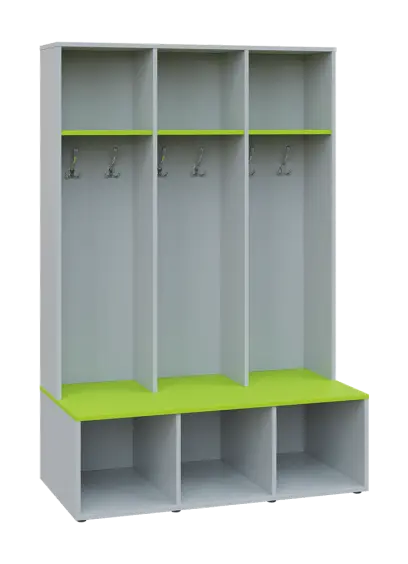 celolaminové otevřené šatní skříně jsou koncipované do sportovišť a šaten, otevřená šatní část obsahuje 2x trojháček
