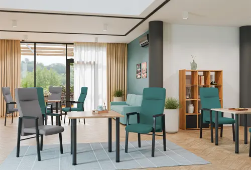 vhodné především pro seniorská a ústavní zařízení, pevná konstrukce zaručuje stabilitu, zatímco moderní černá barva zajišťuje stylový vzhled, který se hodí do jakéhokoliv interiéru