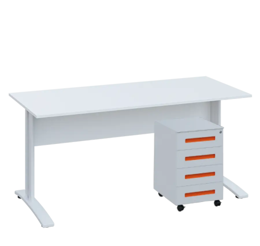 kancelářský stůl se stabilní podnoží, povrchová úprava kovové podnože práškovým vypalovacím lakem, pojízdný kovový kontejner se 4 zásuvkami, v horní zásuvce umístěn tužkovník