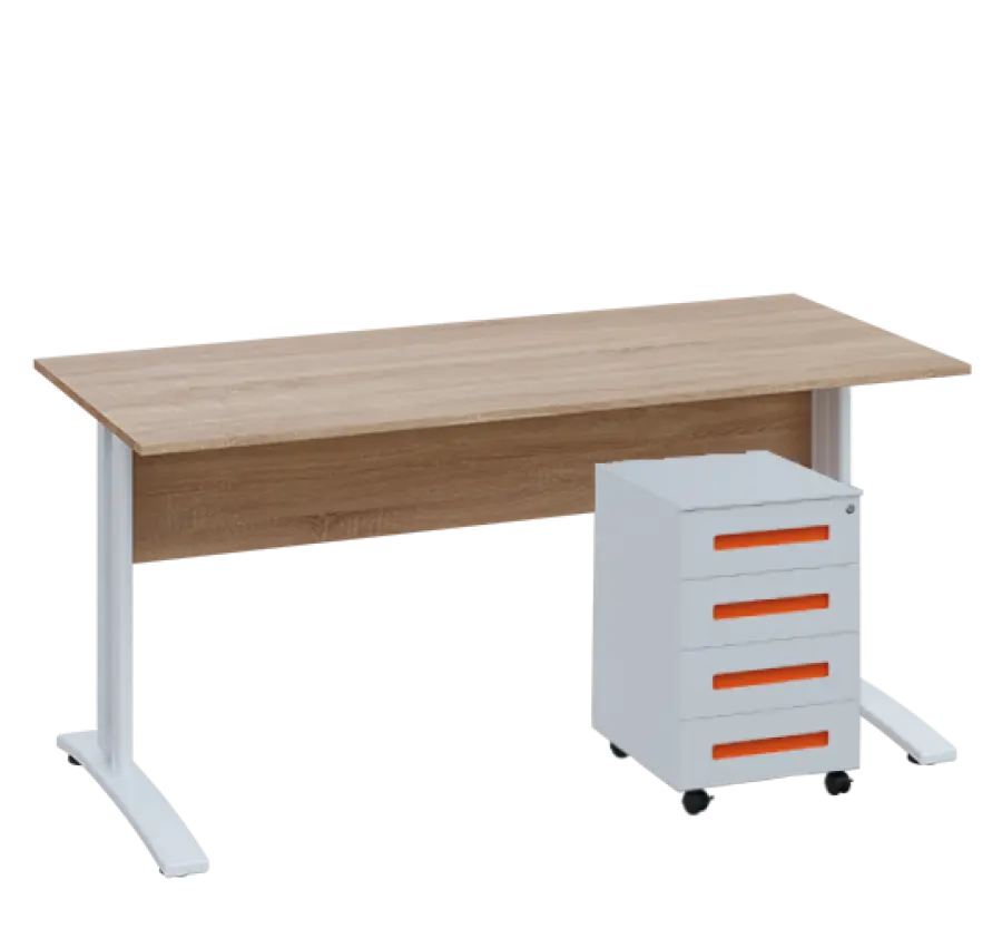 kancelářský stůl se stabilní podnoží, povrchová úprava kovové podnože práškovým vypalovacím lakem, pojízdný kovový kontejner se 4 zásuvkami, v horní zásuvce umístěn tužkovník