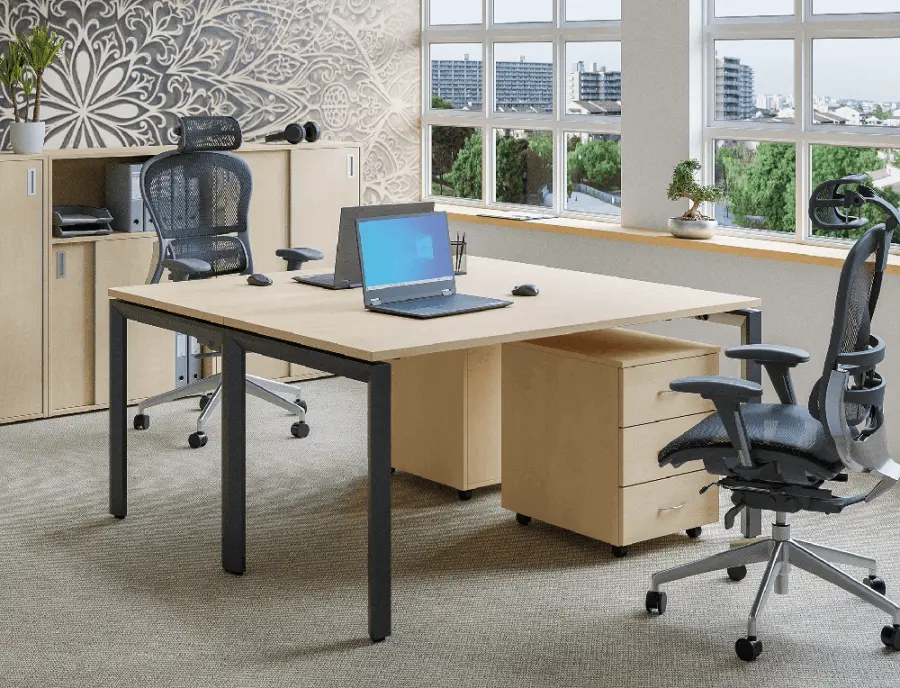 kancelářský stůl se stabilní podnoží, kovová podnož ve tvaru "U" opatřena rektifikací, pojízdný kontejner, centrální zámek