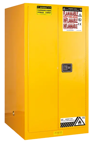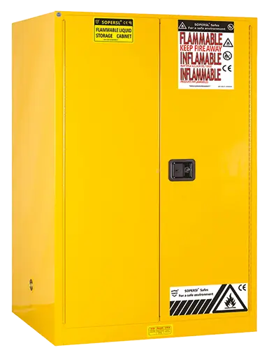kovová svařovaná skříň s dvouplášťovou konstrukcí pro bezpečné skladování hořlavých látek a chemikálií, skříň má v bocích větrací otvory s tavnými pojistkami