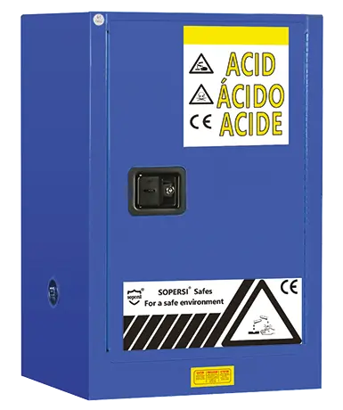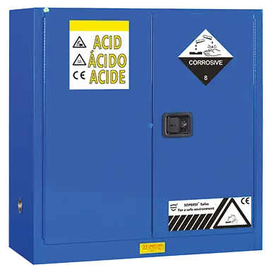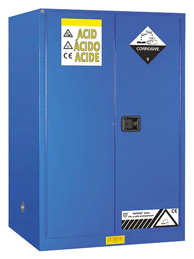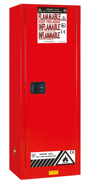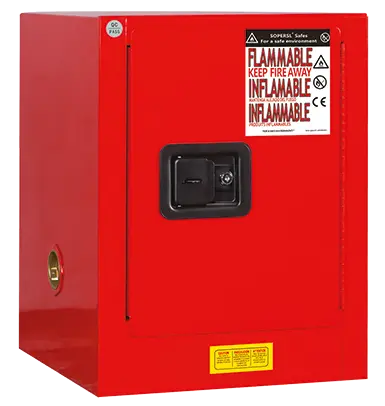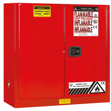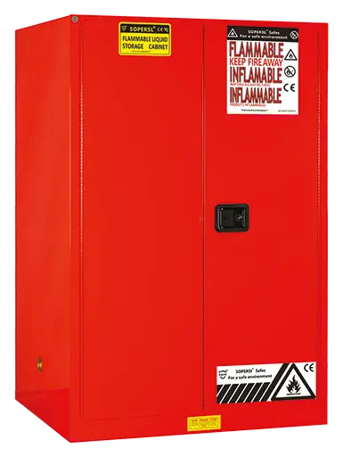 kovová svařovaná skříň s dvouplášťovou konstrukcí pro bezpečné skladování hořlavých látek a chemikálií, skříň má v bocích větrací otvory s tavnými pojistkami