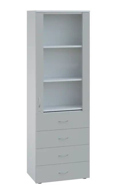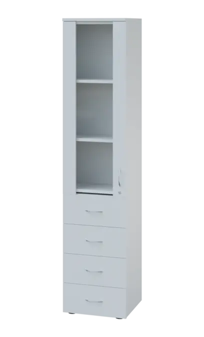 LE - 44 skříň léková prosklená, levá, korpus šedý, dvířka bílá