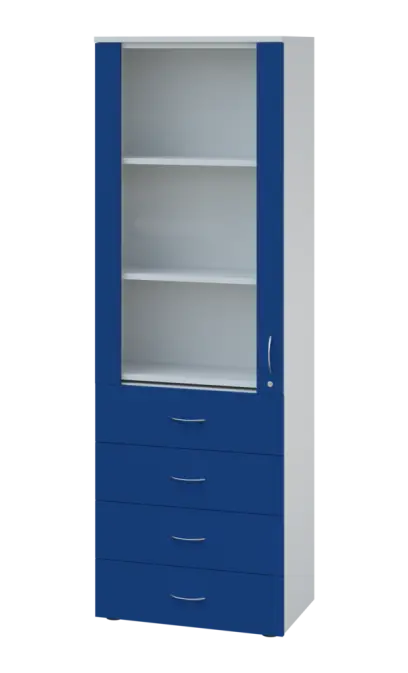 LE - 64 skříň léková prosklená, levá, korpus bílý, dvířka královská modř
