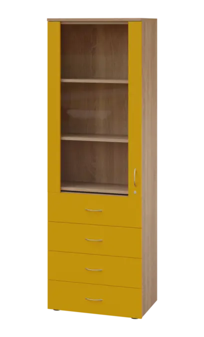 LE - 64 skříň léková prosklená, levá, korpus dub bardolino, dvířka žlutá odio