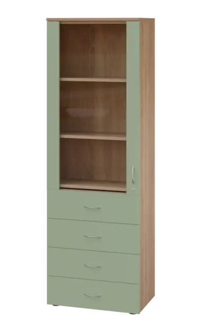 LE - 64 skříň léková prosklená, levá, korpus dub bardolino, dvířka šedo-zelinkavá
