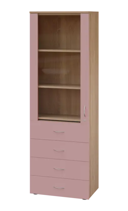 LE - 64 skříň léková prosklená, levá, korpus dub bardolino, dvířka pastelově růžová
