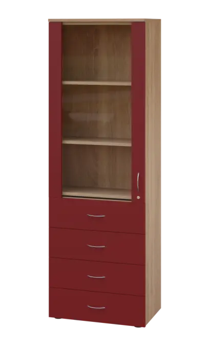 LE - 64 skříň léková prosklená, levá, korpus dub bardolino, dvířka burgundská