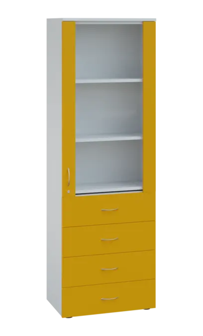 LE - 64 skříň léková prosklená, pravá, korpus bílý, dvířka žlutá odio