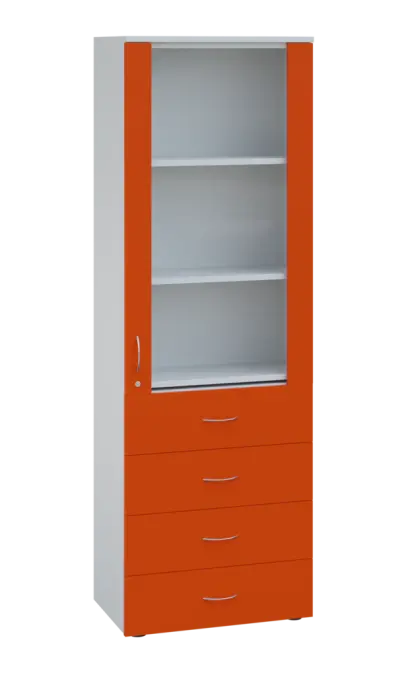 LE - 64 skříň léková prosklená, pravá, korpus bílý, dvířka mandarinka