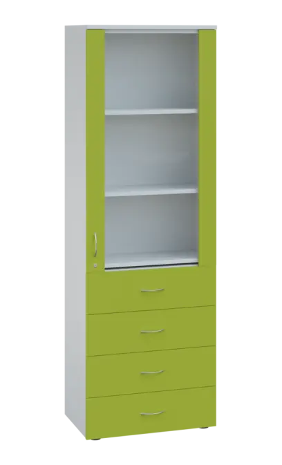 LE - 64 skříň léková prosklená, pravá, korpus bílý, dvířka jarní zeleň