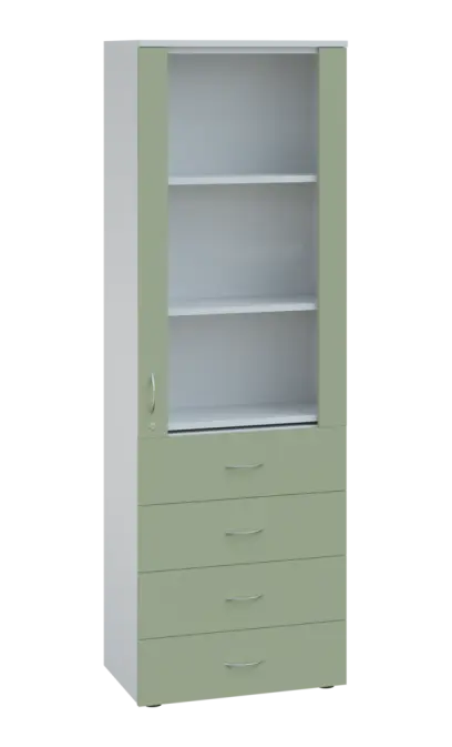 LE - 64 skříň léková prosklená, pravá, korpus bílý, dvířka šedo-zelinkavá