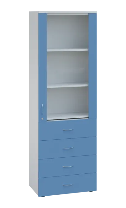 LE - 64 skříň léková prosklená, pravá, korpus bílý, dvířka pastelově modrá