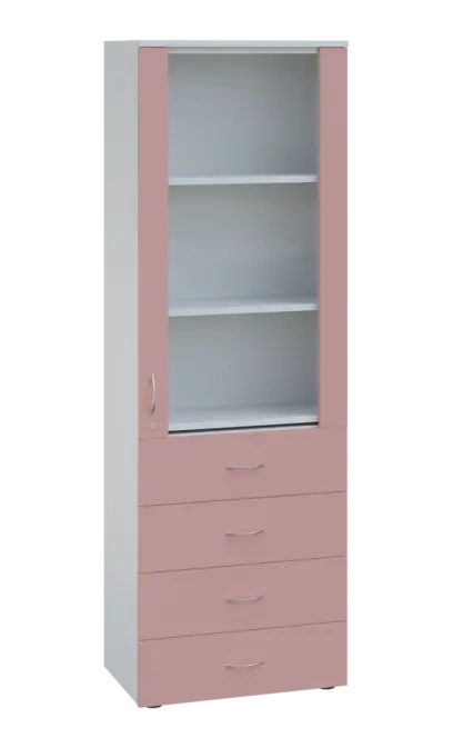 LE - 64 skříň léková prosklená, pravá, korpus bílý, dvířka pastelově růžová