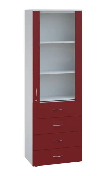 LE - 64 skříň léková prosklená, levá, korpus šedý, dvířka burgundská