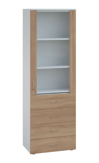 LE - 64 skříň léková prosklená, pravá, korpus bílý, dvířka dub bardolino