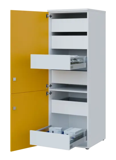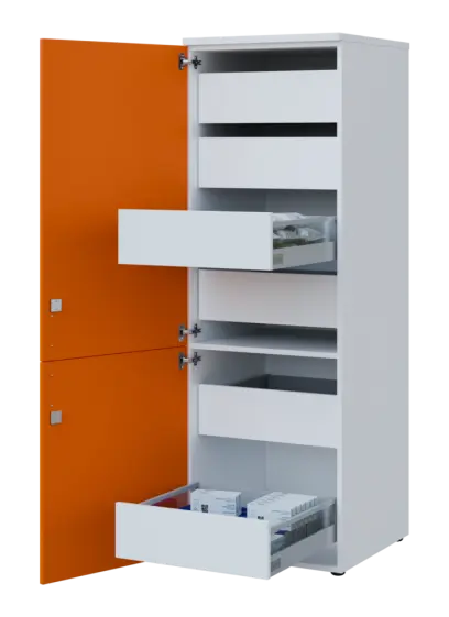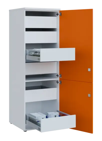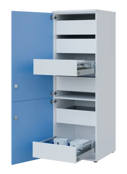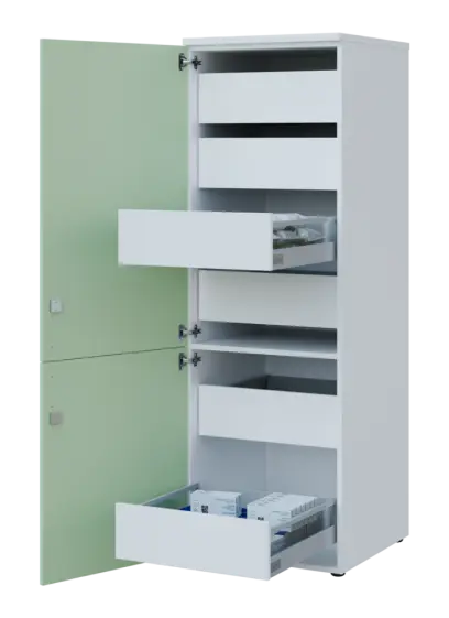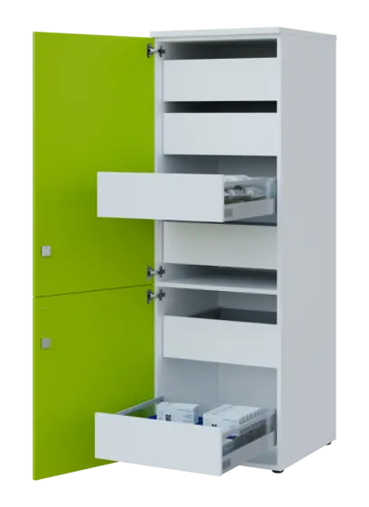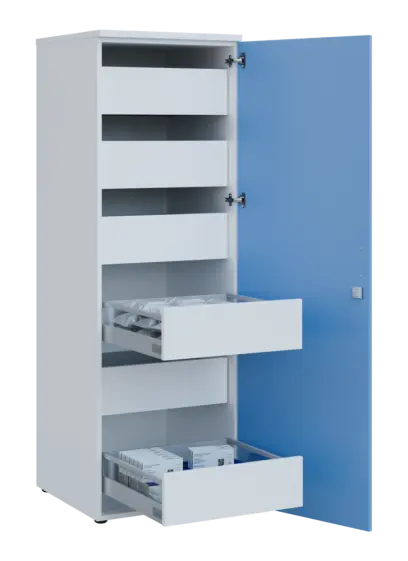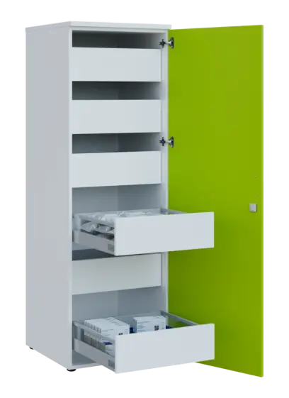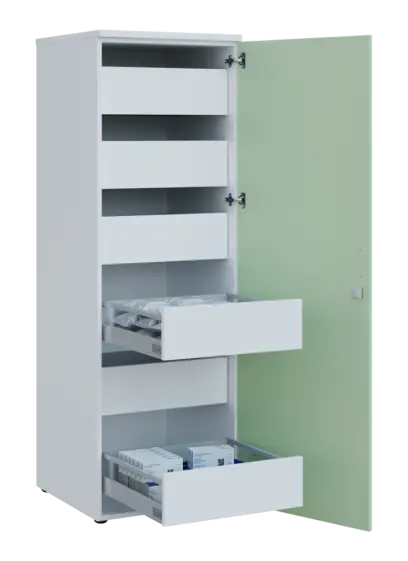 zásuvkové lékařské skříně zajišťují snadnou manipulaci, přehlednost a maximální využití prostoru, zásuvky se snadno vysouvají a zasouvají i při plném zatížení