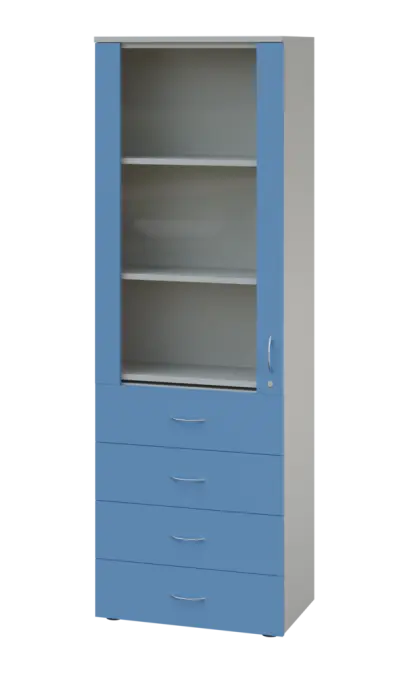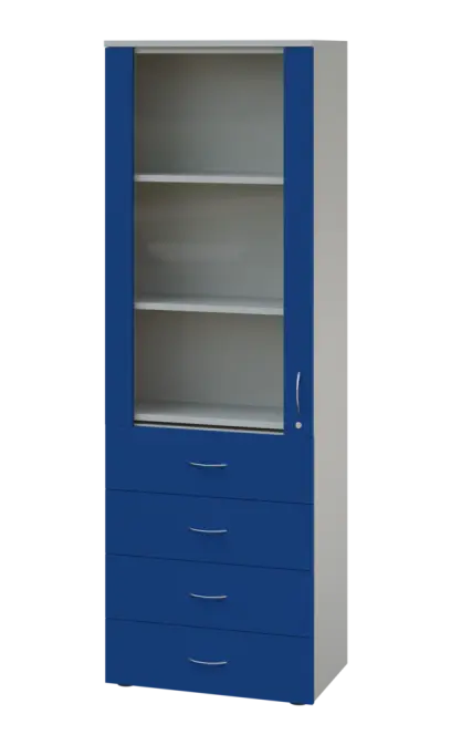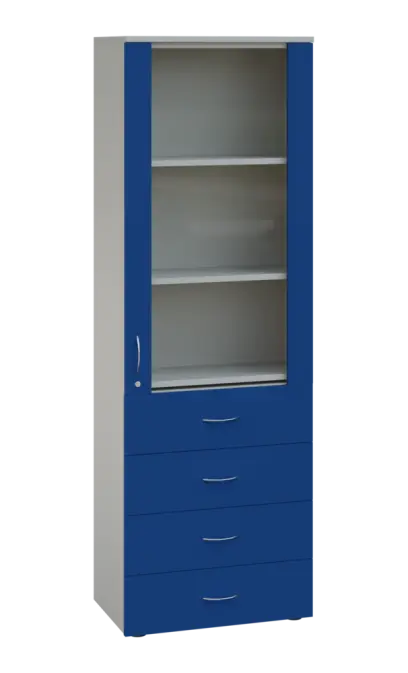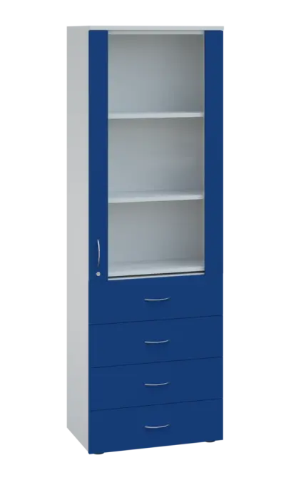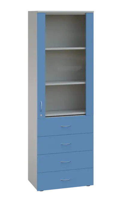 LE - 64 skříň léková prosklená, pravá, korpus šedý, dvířka královská modř