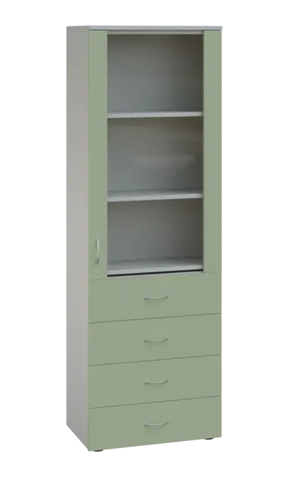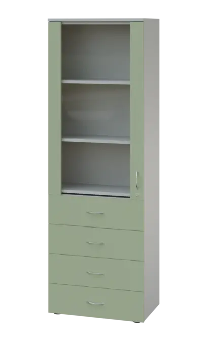 LE - 64 skříň léková prosklená, pravá, korpus šedý, dvířka jarní zeleň