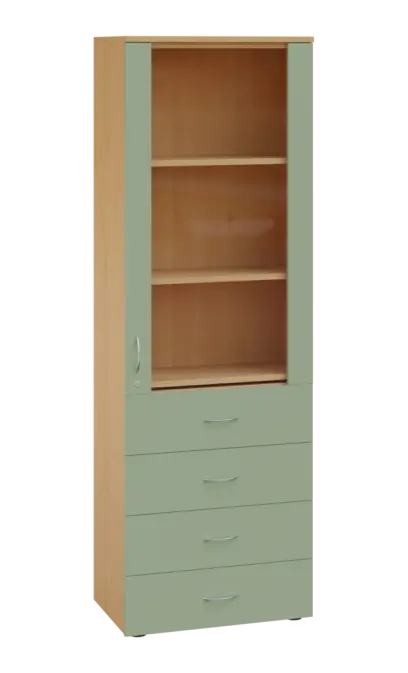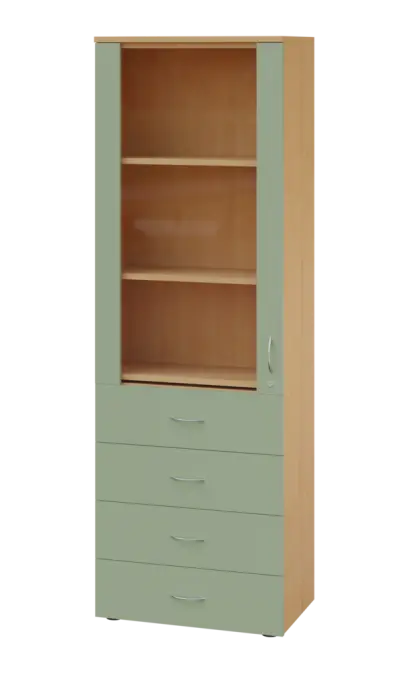 LE - 64 skříň léková prosklená, pravá, korpus javor horský, dvířka šedo-zelinkavá