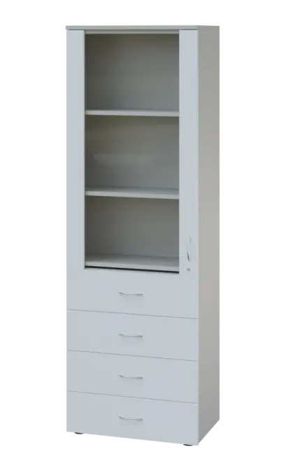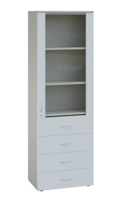 LE - 64 skříň léková prosklená, pravá, korpus šedý, dvířka bílá
