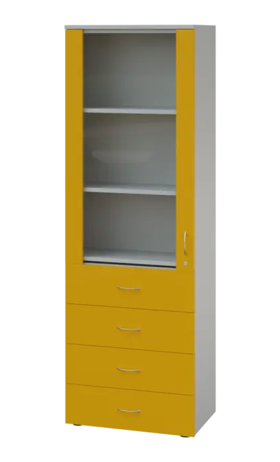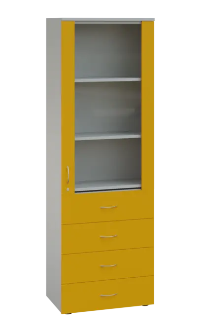 LE - 64 skříň léková prosklená, pravá, korpus šedý, dvířka žlutá odio
