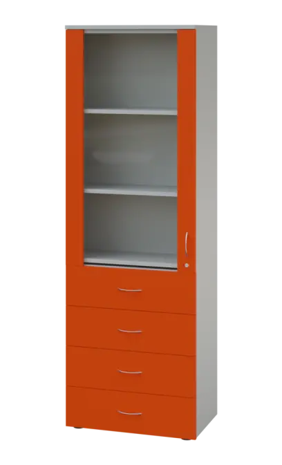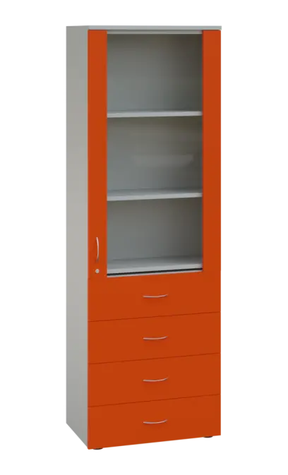 LE - 64 skříň léková prosklená, pravá, korpus šedý, dvířka mandarinka