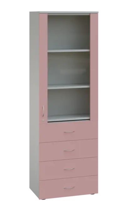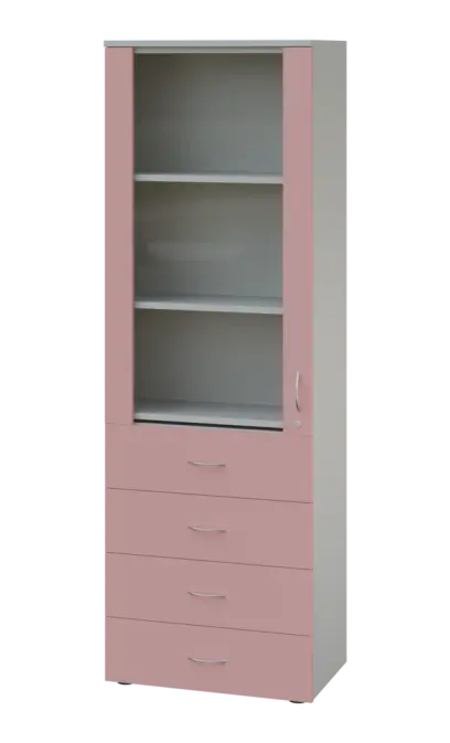 LE - 64 skříň léková prosklená, pravá, korpus šedý, dvířka pastelově růžová