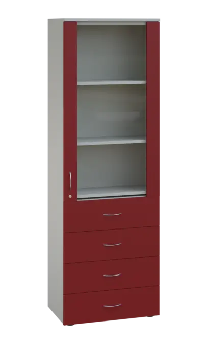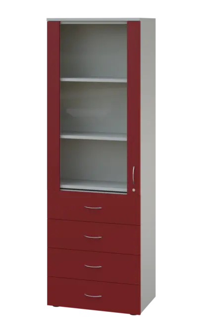 LE - 64 skříň léková prosklená, pravá, korpus šedý, dvířka burgundská