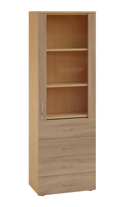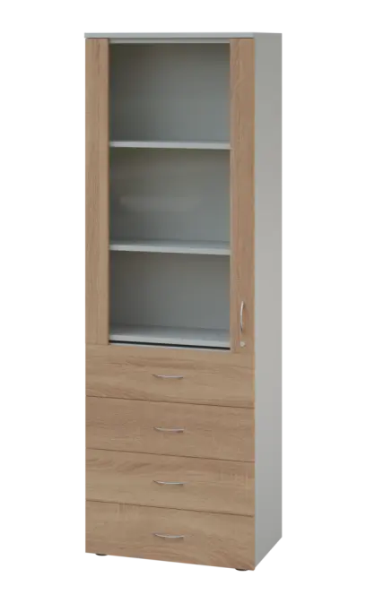 LE - 64 skříň léková prosklená, pravá, korpus šedý, dvířka dub bardolino