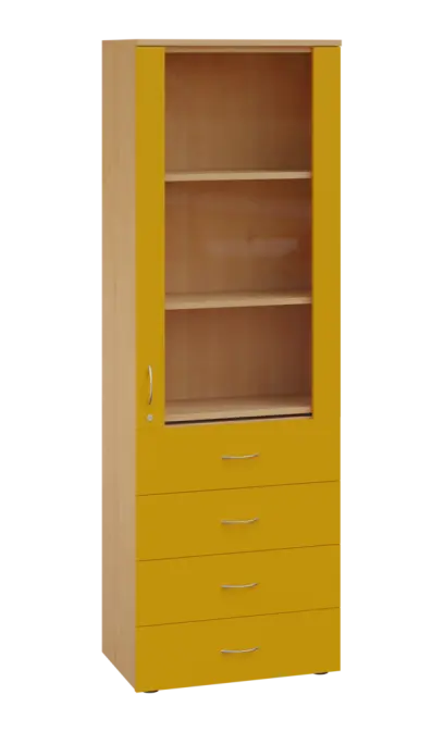 LE - 64 skříň léková prosklená, pravá, korpus javor horský, dvířka žlutá odio