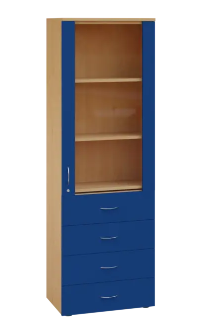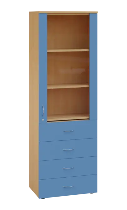 LE - 64 skříň léková prosklená, pravá, korpus javor horský, dvířka královská modř