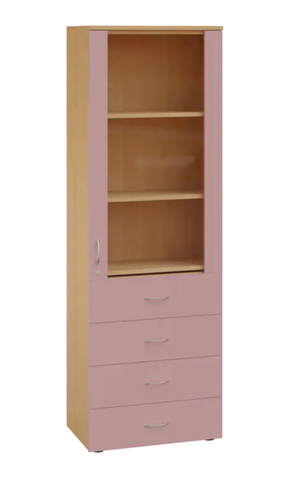 LE - 64 skříň léková prosklená, pravá, korpus javor horský, dvířka pastelově růžová