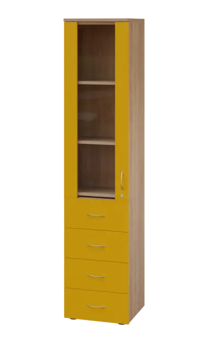 LE - 44 skříň léková prosklená, levá, korpus dub bardolino, dvířka žlutá odio