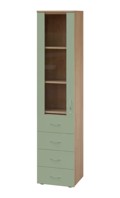 LE - 44 skříň léková prosklená, levá, korpus dub bardolino, dvířka jarní zeleň
