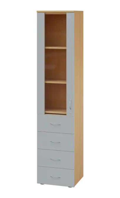 LE - 44 skříň léková prosklená, levá, korpus javor horský, dvířka šedá