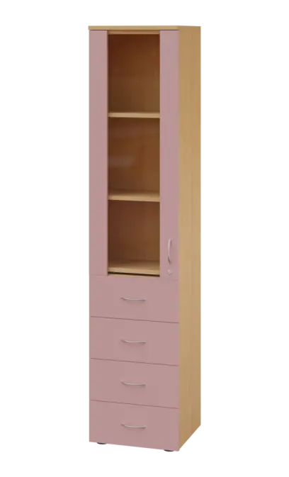LE - 44 skříň léková prosklená, levá, korpus javor horský, dvířka pastelově růžová