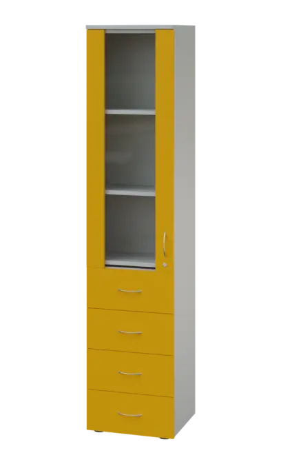 LE - 44 skříň léková prosklená, levá, korpus šedý, dvířka žlutá odio