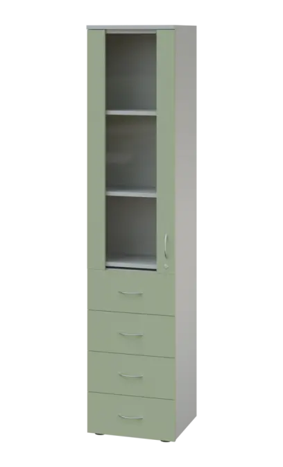 LE - 44 skříň léková prosklená, levá, korpus šedý, dvířka jarní zeleň