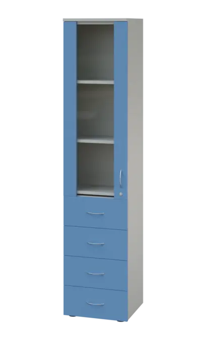 LE - 44 skříň léková prosklená, levá, korpus šedý, dvířka pastelově modrá