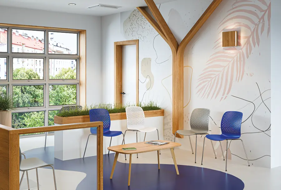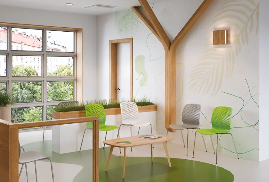 designová plastová židle jemných linií s perforovaným opěrákem, ergonomicky tvarovaný sedák, kovová chromovaná kostra s plastovými kluzáky na ochranu podlahových krytin