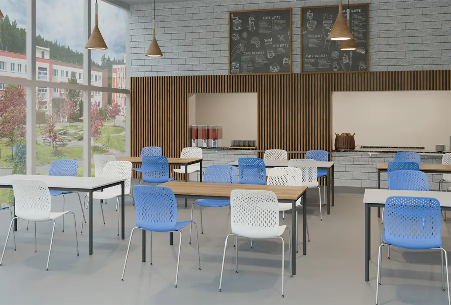 designová plastová židle jemných linií s perforovaným opěrákem, ergonomicky tvarovaný sedák, kovová chromovaná kostra s plastovými kluzáky na ochranu podlahových krytin